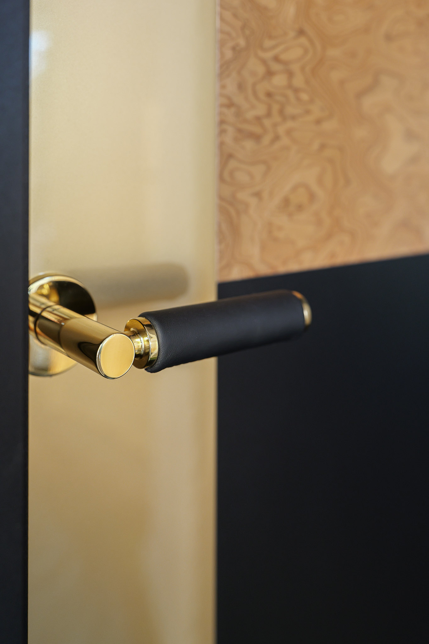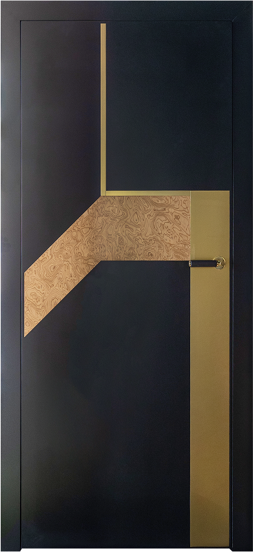 Model Lilak z kolekcji Paprocki & Brzozowski dla INTER DOOR to drzwi, które łączą w sobie elegancję i nowoczesność. Charakteryzują się matową czernią, która stanowi tło dla subtelnych, złotych zdobień oraz naturalnego forniru, tworząc unikatową kombinację faktur i kolorów.