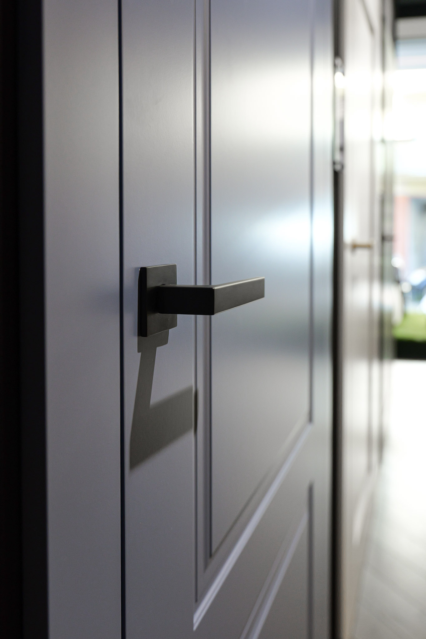 Prezentowany na ekspozycji model VITA 5 to połączenie eleganckiej prostoty z nowoczesnym detalem, który przyciąga uwagę już na pierwszy rzut oka. Skrzydło wykończone zostało w stylowym kolorze RAL 5014 (niebieskoszary), który w zestawieniu z czarnymi okuciami tworzy ponadczasową, ale świeżą estetykę dla współczesnych wnętrz. Charakterystyczny frez cięty pod kątem 90° nadaje drzwiom wyrazistego rysu, jednocześnie zachowując subtelność i umiar. Bezprzylgowe skrzydło, w wariancie prawym, standardowej szerokości 80 cm, zostało uzupełnione o opaski maskujące VERA 80 mm, precyzyjnie zacięte pod kątem 45 ° – ten detal dodatkowo podkreśla dbałość o estetykę oraz spójność wykonania. Całość uzupełniona jest o klamkę TUPAI model 2275 5SQ w wykończeniu 155 – czarny mat velvet.