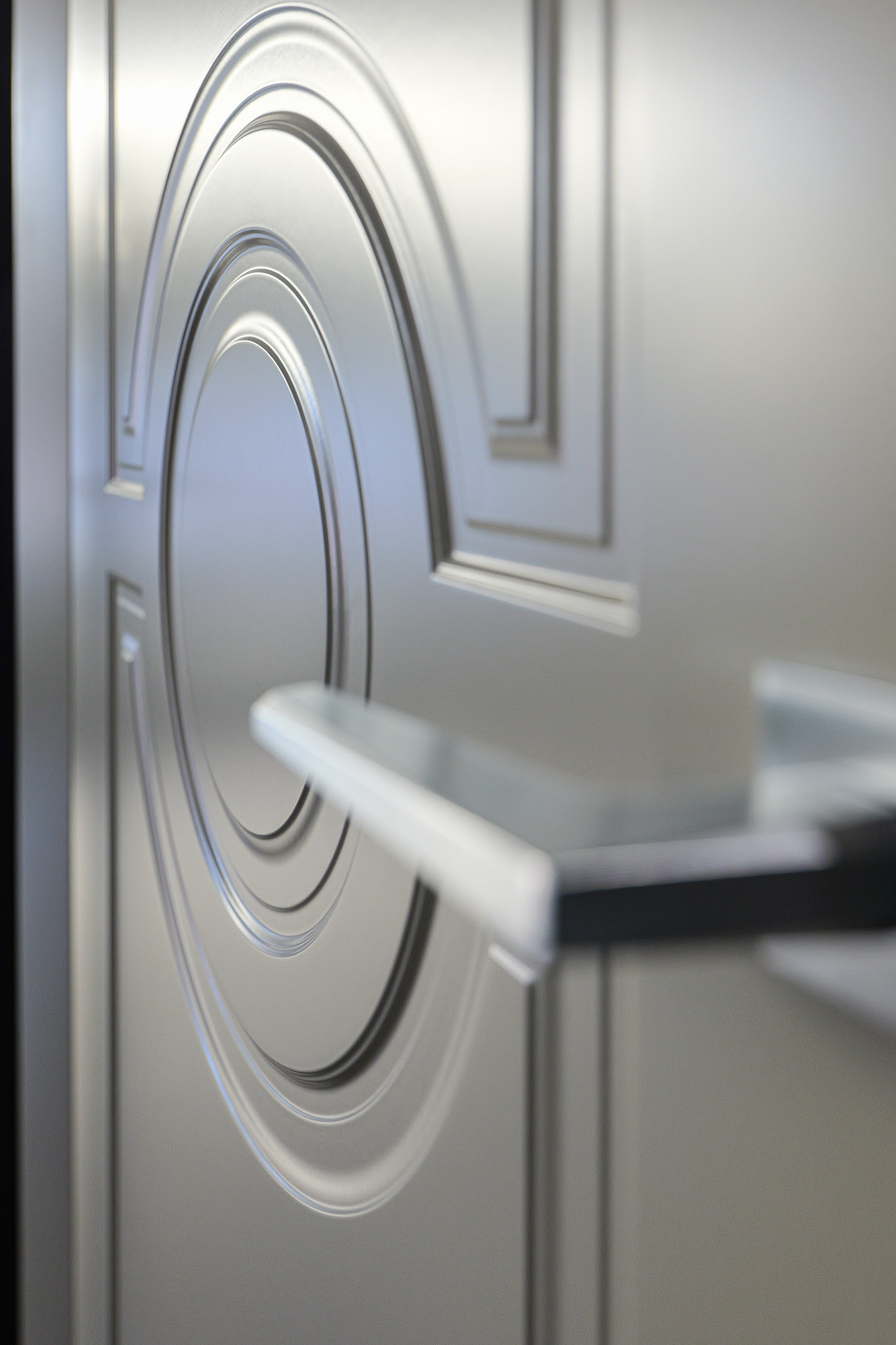 Model OMIC Pełne to wyjątkowe drzwi o wyrazistym detalu – geometrycznym frezie w formie koła. Egzemplarz prezentowany w naszym salonie został pomalowany w kolorze RAL 7044 i wyposażony w chromowane okucia. To lewe, bezprzylgowe drzwi o niestandardowej wysokości, z opaskami 80 mm ciętymi pod kątem 45 °. Dla pełnego efektu zastosowano klamkę TUPAI w wersji 4151 5SQ w wykończeniu 96 – chrom satyna.