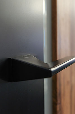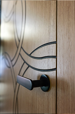 Model OMIC Pełne to wyjątkowe drzwi o wyrazistym detalu – geometrycznym frezie w formie koła. Egzemplarz prezentowany w naszym salonie został pomalowany w kolorze RAL 7044 i wyposażony w chromowane okucia. To lewe, bezprzylgowe drzwi o niestandardowej wysokości, z opaskami 80 mm ciętymi pod kątem 45 °. Dla pełnego efektu zastosowano klamkę TUPAI w wersji 4151 5SQ w wykończeniu 96 – chrom satyna.