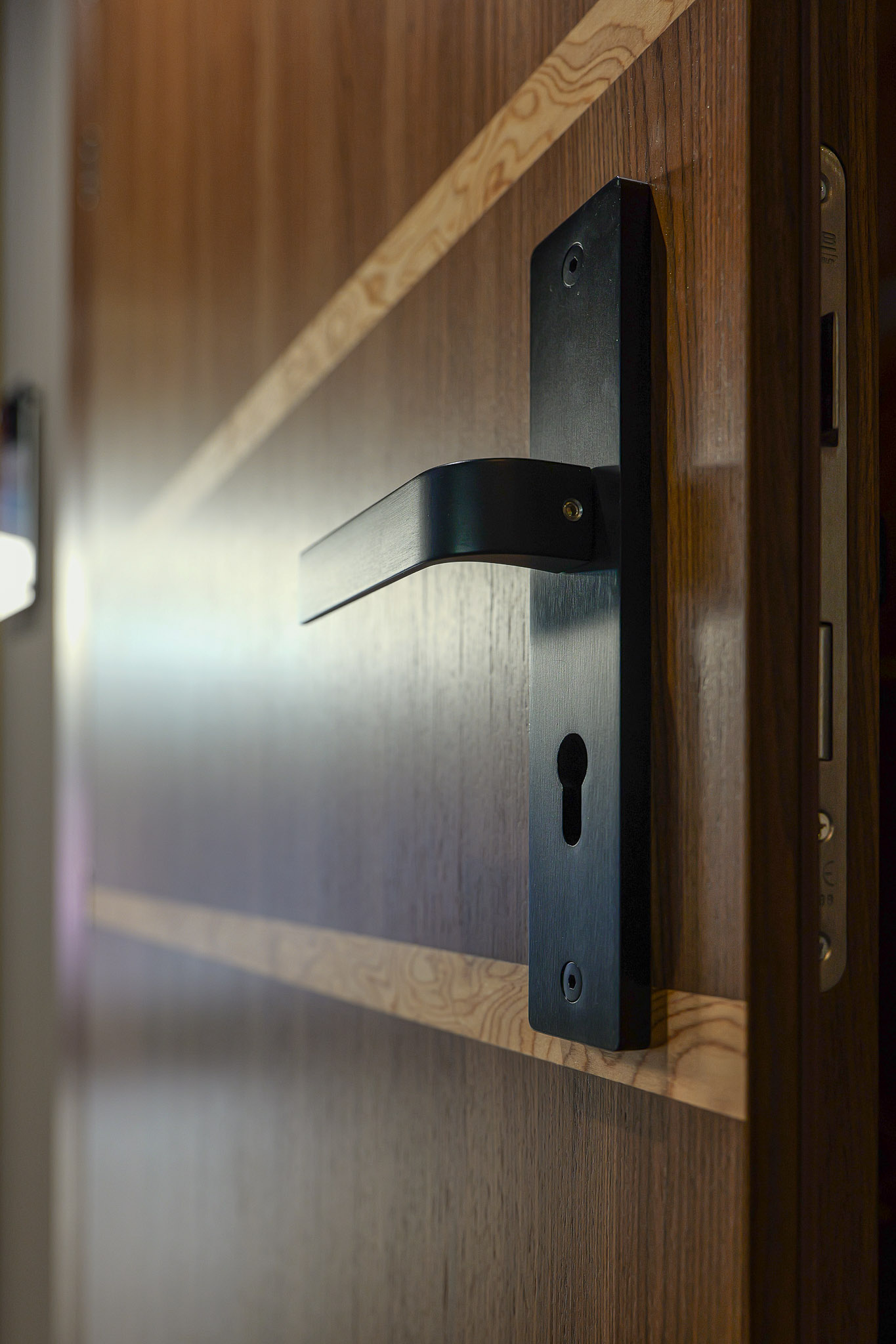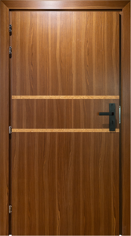 Model WENUS to drzwi przeciwpożarowe, które nie tylko chronią, ale też podkreślają charakter wnętrza. Na ekspozycji prezentujemy wariant wykończony we wzorze Alba Natura – połączenie Natura Dąb Mokka z dekoracyjnymi, poziomymi intarsjami w odcieniu Orzech Czeczot. Ten subtelny detal dodaje skrzydłu elegancji i głębi, nie rezygnując przy tym z funkcji technicznych. Drzwi wyposażone są w chromowane okucia oraz opaski maskujące zacięte pod kątem 45°, co dopełnia spójną, precyzyjnie zaprojektowaną formę. Całość zamyka klamka TUPAI, model 3215 w kolorze 153 – czarnym.